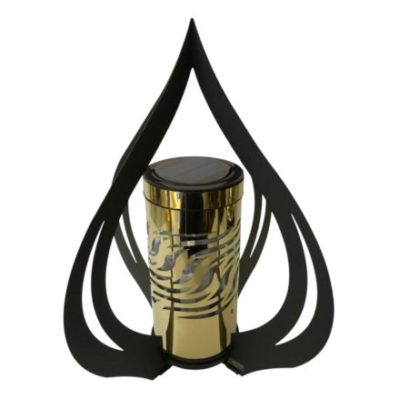 | Piękny srebrny solarny znicz o podstawie ze stali malowanej proszkowo, ścianki boczne oraz przód wykonany ze stali chromowanej. Na górze znicza znajduje się fotowoltaiczny panel, który zasila żółte światło znajdujące się w tubie znicza.