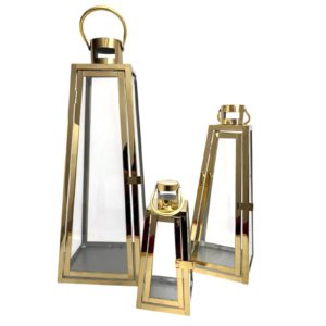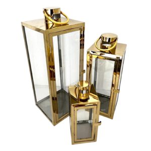 Stylowy i elegancki zestaw trzech metalowych latarenek w kolorze złotym to idealna dekoracja do Twojego domu, ogrodu lub tarasu. Subtelny blask świecy w połączeniu z połyskiem złota tworzy wyjątkowy klimat – idealny zarówno na co dzień, jak i podczas uroczystości.