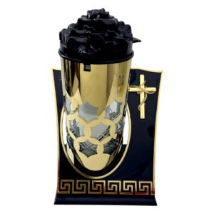 | Content | Elegancki znicz nagrobny w nowoczesnym stylu, łączący głęboką czerń z lustrzanym wykończeniem w kolorze złota. Subtelna dekoracja w postaci krzyża symbolizuje pamięć, miłość oraz szacunek dla bliskich. Dzięki starannemu wykonaniu i ponadczasowej stylistyce znicz doskonale prezentuje się na każdym pomniku – zarówno podczas świąt, jak i codziennych odwiedzin.