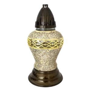 Elegancki znicz w formie karafy, zdobiony motywem serca. Utrzymany w złoto-srebrnej kolorystyce, pięknie komponuje się z nagrobkiem, podkreślając pamięć i szacunek wobec bliskich. Jego klasyczny kształt i wysokiej jakości wykonanie sprawiają, że prezentuje się niezwykle dostojnie.