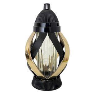 Elegancki znicz w klasycznej formie, wykonany z połączenia szkła i trwałego tworzywa sztucznego. Dekoracyjne złoto-czarne wykończenie nadaje mu wyjątkowego charakteru, dzięki czemu znakomicie prezentuje się na grobie zarówno podczas uroczystości, jak i na co dzień.
