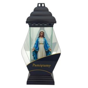 Przezroczyste szkło eksponuje subtelną figurę Maryi, nadając całości głębi i wyjątkowej estetyki. Stabilna konstrukcja oraz klasyczna kolorystyka czerni ze złotymi akcentami sprawiają, że znicz prezentuje się niezwykle elegancko i ponadczasowo.