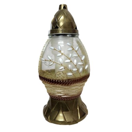 Korpus znicza wykonany jest z wysokiej jakości szkła z dekoracyjnymi tłoczeniami, które pięknie rozpraszają światło i tworzą nastrojowy, spokojny blask. Kapturek oraz podstawka z trwałego tworzywa sztucznego zapewniają stabilność i odporność na warunki atmosferyczne.